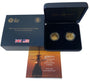 Two-coin proof set, 2020, struck to commemorate 400 years since the Mayflower voyage, featuring Great Britain, Elizabeth II (1952- 2022), gold proof Quarter Ounce of Twenty Five Pounds, 2020, struck in 24 carat gold, crowned head right, JC initials below for designer Jody Clark, Latin legend surrounding, ELIZABETH II. D. G. REG. F. D. 25 POUNDS., rev. design by Chris Costello, the Mayflower ship in stormy seas, MAYFLOWER below, dates 1620 and 2020 above, 7.80g; along with United States, gold proof Quarter Ounce of Ten Dollars, 2020, struck in 24 carat gold, West Point mint, design by Chris Costello, Wampanoag family watching the approach of the Mayflower, denomination below, legends E PLURIBUS UNUM and PATUXET above, rev. design by Phebe Hemphill, jugate portraits of Pilgrim man and woman left, legend PLYMOUTH above between dates 1620 and 2020, UNITED STATES OF AMERICA below separated by mayflower blossoms, 7.776g. Brilliant and as struck, an extremely popular set in box of issue with certificate of authenticity. SOLD OUT AT THE ROYAL MINT AND UNITED STATES MINT