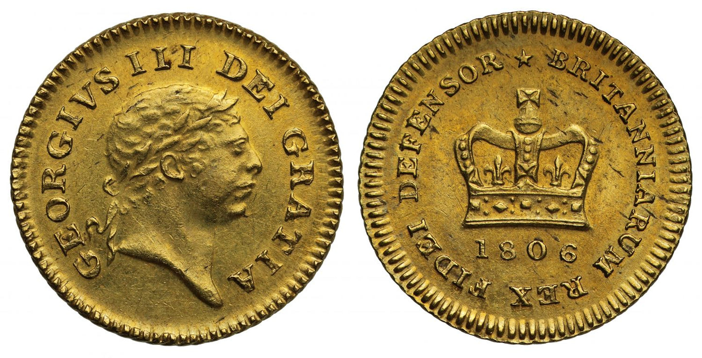 George III (1760-1820), gold Third Guinea, 1806, third type, second laureate head right, Latin legend and toothed border surrounding, GEORGIVS III DEI GRATIA. rev. large crown, date below, legend surrounding commencing top, * BRITANNIARUM REX FIDEI DEFENSOR, weight 2.72g (Schneider -; Bull EGC 877; MCE 457; S.3740). Toned, with some light flecking, extremely fine.
