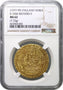 Richard II (1377-99),gold Noble of six shillings and eight pence, Calais Mint, type 3a, with French title resumed, armoured King standing in ship with upright sword and quartered shield, flag at stern of ship for Calais Mint, Latin legend and beaded borders surrounding, double saltire stops in legend, RIC ARDxx DIxx GRAxx REXxx AnGLxx Zx FRAnCxx DnSxx hIBxx Zx AQ T,rev.R at centre of ornate cross with lis terminals, crown over lion in each angle, all within a tressure of eight arcs, fleurs in spandrels, Latin legend and beaded border surrounding, initial mark cross pattée, IhCxx AVTEmxx TRAnSIEnSxx PERxx mEDIVxx ILLORVmxx IBATx, weight 7.72g (Schneider 167; N.1307; S.1662).Struck from a rusted obverse die, well centred, full weight, has been slabbed and graded by NGC as MS62.